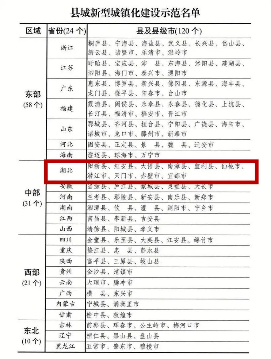 其中,湖北10个县市榜上有名!分别是:阳新县、红安县、大悟县、南漳县、监利县、仙桃市、潜江市、天门市、赤壁市、宜都市。