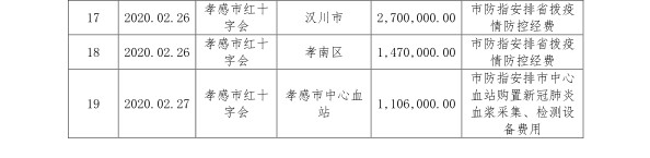 以上款物,除定向捐赠外,社会各界捐赠的款物均由孝感市新型冠状病毒感染的肺炎防控指挥部统一调配使用(后续捐赠情况将持续发布,敬请关注,欢迎监督)。